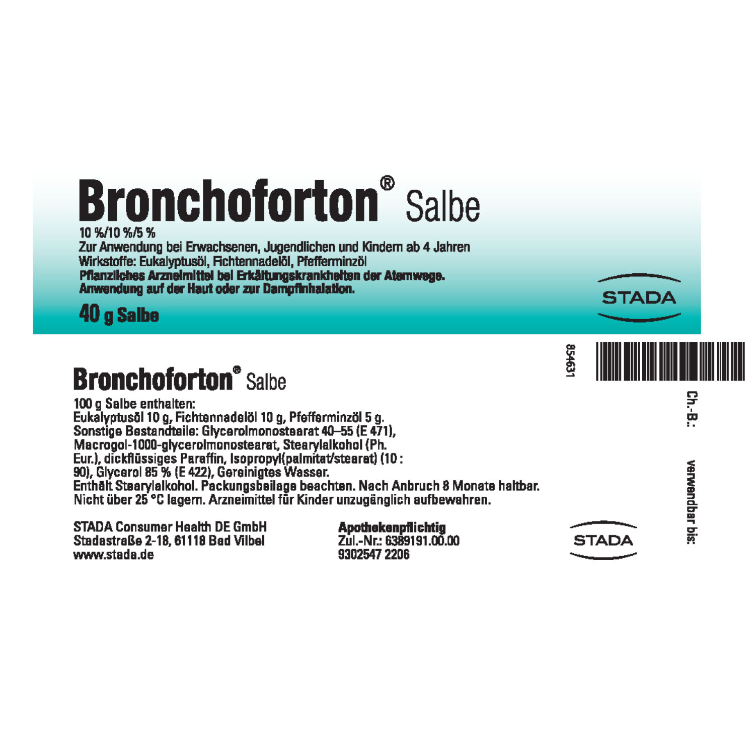 Nach Bedarf 2- bis 4-mal täglich Inhalieren oder Einreiben. Zum Inhalieren Bronchoforton® Salbe mit Wasser übergießen und die aufsteigenden Dämpfe etwa 10 Minuten einatmen. Zum Einreiben Bronchoforton® Salbe auf Brust oder Rücken einmassieren.