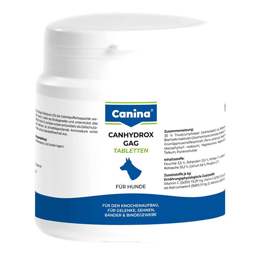 - Dicalciumphosphat: Ein organischer Stoff, der zu 50% im Knochen und zu 90% im Zahn enthalten ist. Er kann die Kallusbildung, die elastische Festigkeit des Knochens, die Ausbildung eines festen Zahnschmelzes, die Ausformung gerader Extremitäten (X- und O-Beine), Durchtrittigkeit und lose Gelenke unterstützen. Bei alten Hunden kann er den Abbau von Knochensubstanz vorbeugen und insgesamt das Skelettsystem unterstützen.