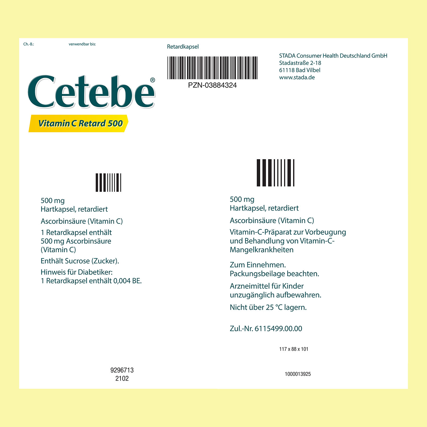 Cetebe® Vitamin C Retard 500 ist ein freiverkäufliches Arzneimittel. Die angegebene empfohlene tägliche Dosis darf nicht überschritten werden. Die Cetebe® Vitamin C Retardkapseln sind unzerkaut mit ausreichend Flüssigkeit einzunehmen.