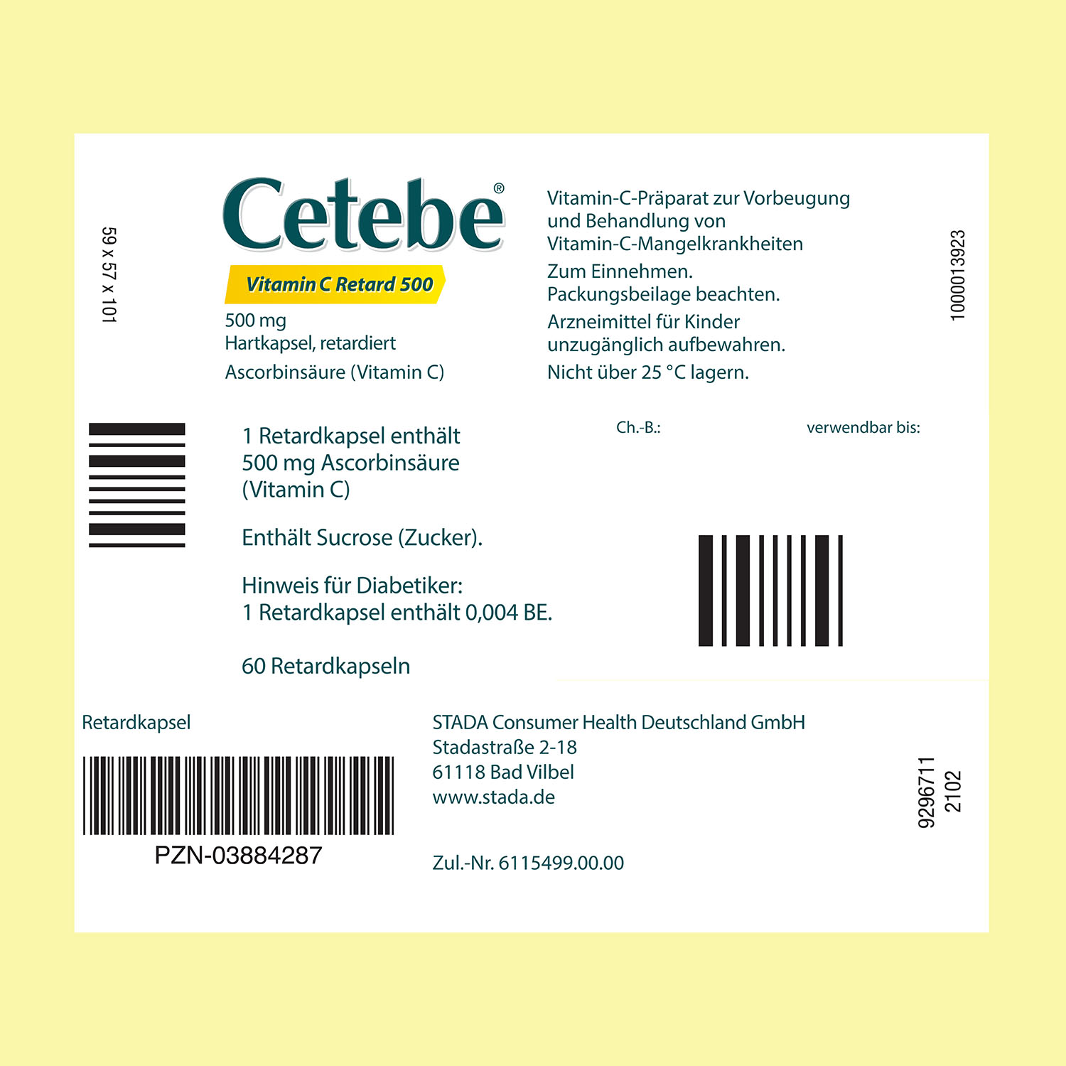 Cetebe® Vitamin C Retard 500 ist ein freiverkäufliches Arzneimittel. Die angegebene empfohlene tägliche Dosis darf nicht überschritten werden. Die Cetebe® Vitamin C Retardkapseln sind unzerkaut mit ausreichend Flüssigkeit einzunehmen.