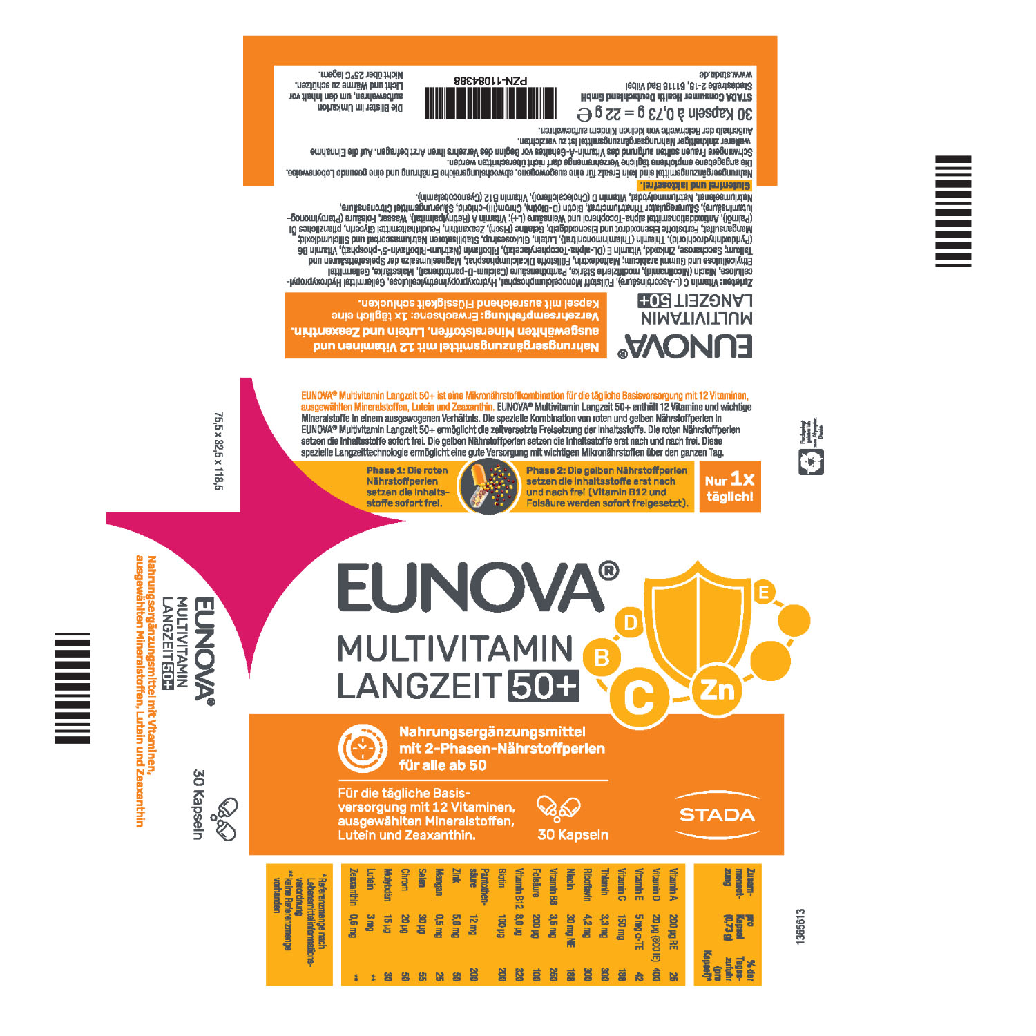 Die EUNOVA® Langzeittechnologie verbessert die Aufnahme von Nährstoffen durch eine spezielle Kombination von schnell und langsam freigesetzten Perlen. Die roten Perlen enthalten fettlösliche Vitamine wie Vitamin A, D, E sowie Mineralstoffe und Carotinoide. Die Schutzhülle löst sich sofort nach der Einnahme im Magen auf. Der Kern der gelben Perlen besteht aus wasserlöslichen Vitaminen wie Vitamin C, B1, B2, B6, Biotin oder Pantothensäure. Die Nährstoffe sind umhüllt mit einem speziellen Retardierungsfilm, der sich erst nach drei bis neun Stunden nach Einnahme im mittleren Darmabschnitt auflöst.