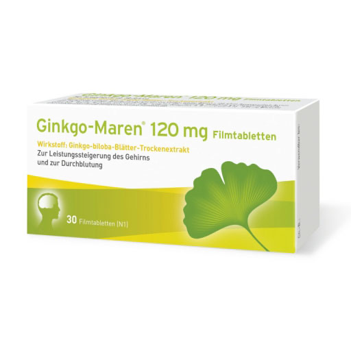 Anwendungsgebiete: Zur symptomatischen Behandlung von hirnorganisch bedingten Leistungsstörungen im Rahmen eines therapeutischen Gesamtkonzeptes bei Abnahme bzw. Verlust erworbener geistiger Fähigkeiten (dementielles Syndrom) mit den Hauptbeschwerden: Gedächtnisstörungen, Konzentrationsstörungen, depressive Verstimmung, Schwindel, Ohrensausen, Kopfschmerzen. Das individuelle Ansprechen auf die Medikation kann nicht vorausgesagt werden. Bevor die Behandlung mit Ginkgo-Maren® begonnen wird, sollte geklärt werden, ob die Krankheitszeichen nicht auf einer spezifisch zu behandelnden Grunderkrankung beruhen.