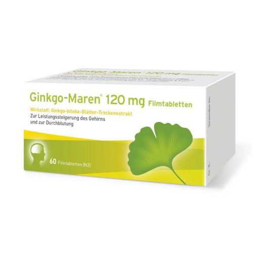 Anwendungsgebiete: Zur symptomatischen Behandlung von hirnorganisch bedingten Leistungsstörungen im Rahmen eines therapeutischen Gesamtkonzeptes bei Abnahme bzw. Verlust erworbener geistiger Fähigkeiten (dementielles Syndrom) mit den Hauptbeschwerden: Gedächtnisstörungen, Konzentrationsstörungen, depressive Verstimmung, Schwindel, Ohrensausen, Kopfschmerzen. Das individuelle Ansprechen auf die Medikation kann nicht vorausgesagt werden. Bevor die Behandlung mit Ginkgo-Maren® begonnen wird, sollte geklärt werden, ob die Krankheitszeichen nicht auf einer spezifisch zu behandelnden Grunderkrankung beruhen.