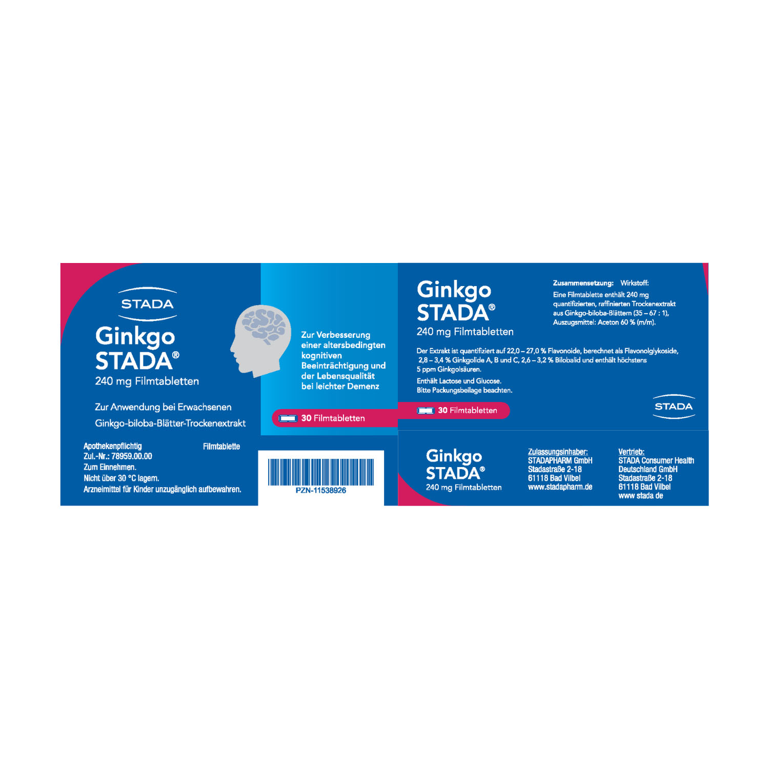 Anwendungsgebiete: Ginkgo STADA® ist ein pflanzliches Arzneimittel zur Verbesserung einer altersbedingten kognitiven Beeinträchtigung und der Lebensqualität bei leichter Demenz. Enthält Lactose und Glucose.