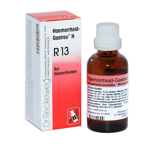 Wirkstoffe: Collinsonia canadensis Dil. D4 1 ml, Hamamelis Dil. D3 1 ml, Nux vomica Dil. D4 1 ml, Paeonia officinalis Dil. D3 1 ml, Acidum nitricum Dil. D6 1 ml, Aesculus Dil. D2 1 ml, Lycopodium Dil. D5 1 ml, Sulfur Dil. D5 1 ml. Die Wirkstoffe 1 bis 4 werden über die vorletzte Stufe gemeinsam potenziert. Die Wirkstoffe 1 bis 7 werden über die letzte Stufe gemeinsam potenziert. Sonstiger Bestandteil: Ethanol 30% (m/m).