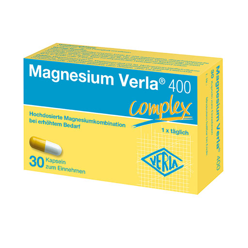 Eine optimale Versorgung mit Magnesium ist sehr wichtig, denn es trägt unter anderem zu einer normalen Muskelfunktion, einer normalen Funktion des Nervensystems und zu einem normalen Energiestoffwechsel bei. Magnesium leistet auch einen Beitrag zur Verringerung von Müdigkeit und Erschöpfung. Dank der hohen Dosierung von 400 mg Magnesium ist Magnesium Verla® 400 bestens geeignet, um Sie im Alltag und in herausfordernden Phasen mit Magnesium zu versorgen – bereits 1 Kapsel pro Tag ist ausreichend. Die geschmacksneutralen Kapseln auf pflanzlicher Cellulose-Basis sind ideal für die tägliche Einnahme geeignet. In Magnesium Verla® 400 wird Magnesiumoxid mit einem möglichst hohen Anteil an organischen Magnesiumcitrat kombiniert.